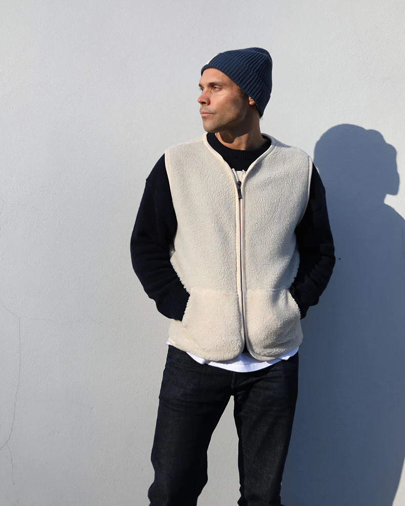 Every wardrobe needs a warm mid-layer. The collarless gilet pairs perfectly with polos and trench coats. Designed to be worn all year round, the off-white colour will pair with anything in your wardrobe.