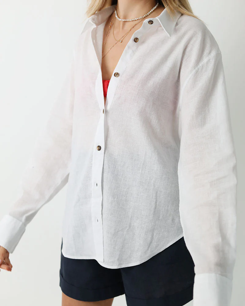 A timeless, lightweight, summer shirt. Made using a soft blend of linen and cotton this pocketless, white shirt is designed to be worn effortlessly and paired with anything.