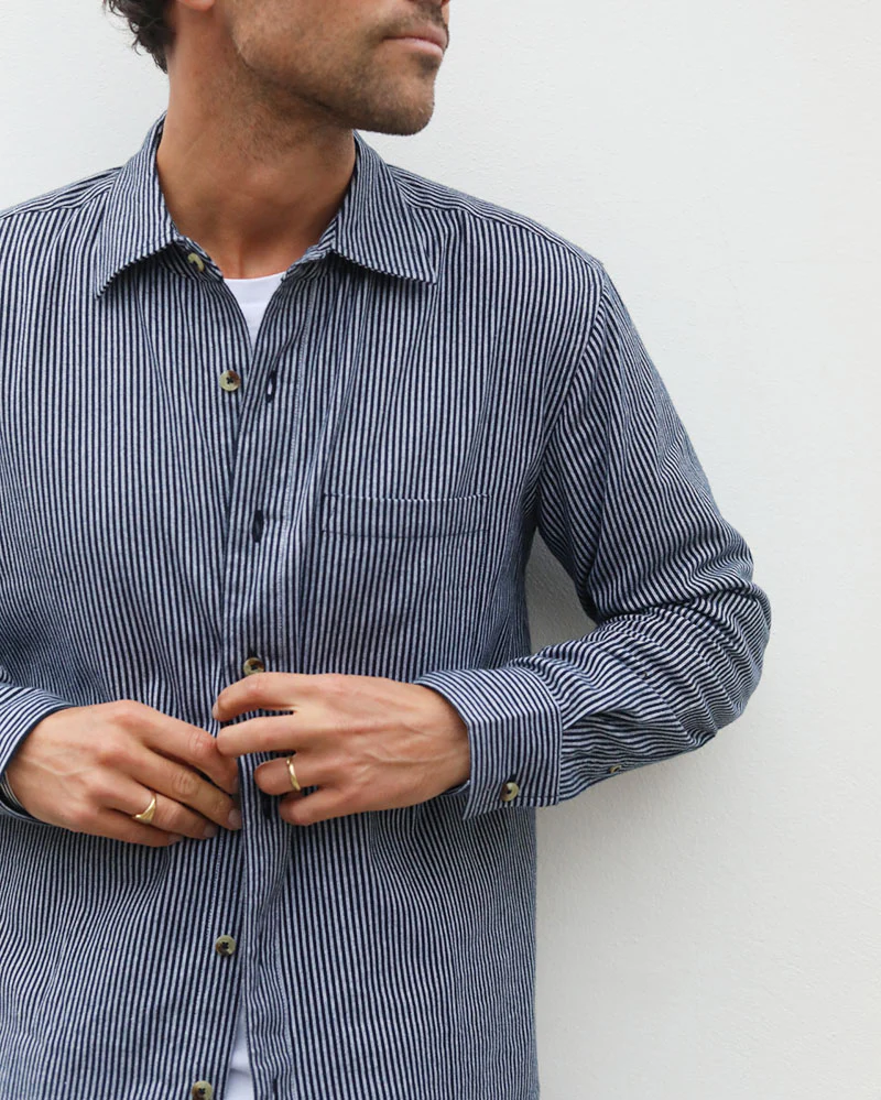 New for AW24 our signature brushed cotton shirt for men in a navy and ecru pinstripe.